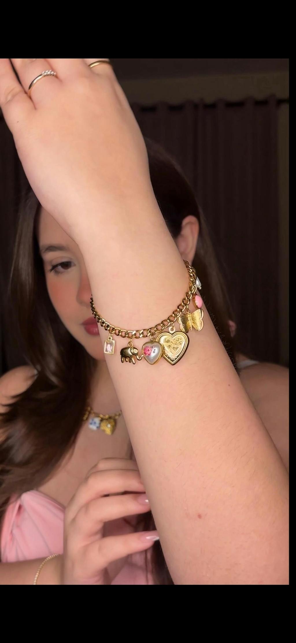 Add a touch of romance with the Ella Heart Charm Bracelet, featuring a floral enamel charm and delicate butterfly accents. The heart-shaped locket holds your cherished photos, combining playful elegance with personal meaning. Crafted in waterproof, hypoallergenic stainless steel with 18K gold polish, this bracelet is lightweight, durable, and perfect for daily wear.